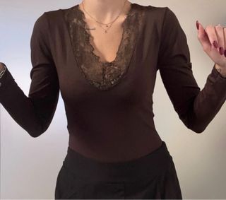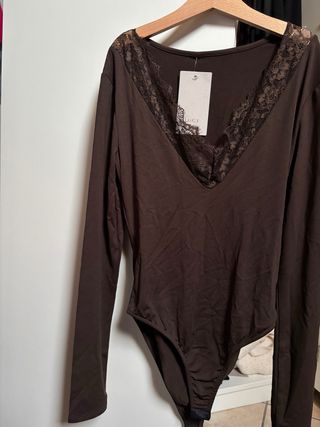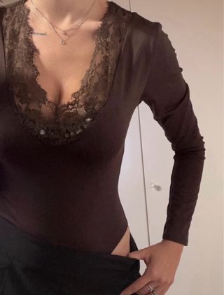 Body elegante con dettagli in pizzo. - Scollo a V con inserti in pizzo. - Maniche lunghe. - Tessuto morbido e confortevole.