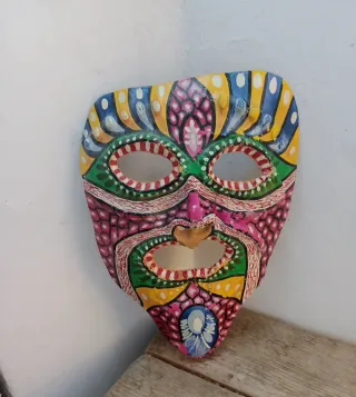 Maschera artigianale in cartapesta, vivacemente decorata con colori brillanti. alta 32 cm larga 22 - Motivi geometrici e floreali. - Dettagli dipinti a mano. - Ideale come oggetto d'arredo o per collezionisti.