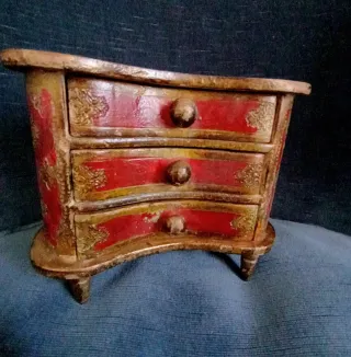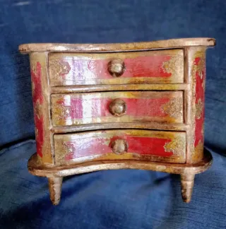Elegante portagioie antico, con finiture dorate e dettagli floreali. alta 14 lunghezza 18 larga 10 - Tre cassetti con pomelli. - Design curvo e decorato. - Stile fiorentino. Bellissima