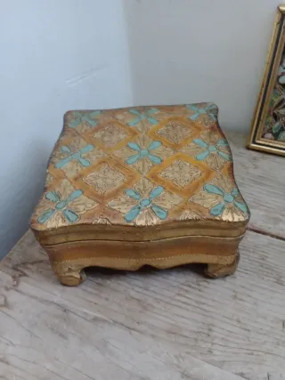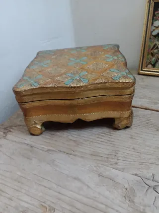 Elegante portagioie antico, con un design ispirato alla tradizione fiorentina. Perfetto per custodire i tuoi preziosi. alto 6 cm 13 x 13 - Decorazioni floreali azzurre su fondo dorato. - Struttura a forma di scrigno con piedini.