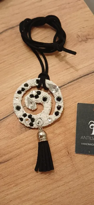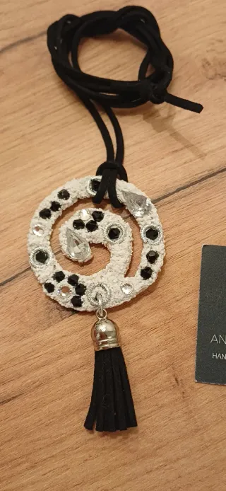 Elegante ciondolo a forma di spirale, impreziosito da strass e perline nere. Un accessorio unico che aggiunge un tocco di brillantezza. - Design a spirale. - Realizzato con la sabbia. - Decorato con strass trasparenti. - Dettagli in perline nere. - Pendente a nappa nero. - Cordino nero per indossarlo.