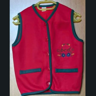 Gilet da bambina in stile bavarese nei tradizionali, tipici colori e fattura: è rosso, completamente bordato di verde, ha finte taschine, chiusura a bottoni, mazzolino di fiori ricamato sopra la tasca sinistra. -Marchio: Zea -Taglia, composizione e norme di trattamento: non ci sono i talloncini indicativi. È vintage e usato ma è comunque in uno stato di conservazione più che buono. Vedi foto, anche per le misure. È un gilet vivace, morbido, caldo, caratteristico.