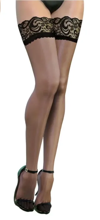 Calze autoreggenti nere 10 den velatissime. Tessuto di nylon e pizzo, setoso, morbido e liscio. Le calze trasparenti.