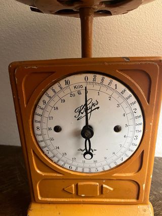 Bilancia da cucina vintage Krups, perfetta per dare un tocco retrò alla tua casa. La sua struttura in metallo arancione e il design classico la rendono un pezzo unico. - Quadrante con indicazioni in grammi e chili. - Design iconico Krups.