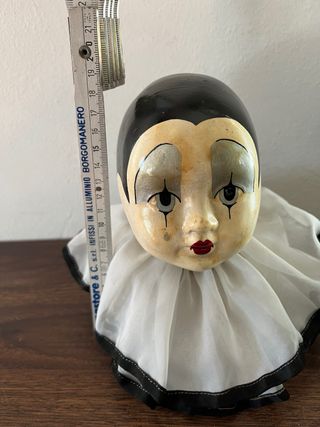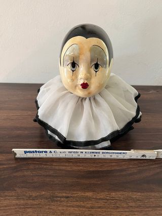 Testa decorativa di un clown con un'espressione malinconica e una gorgiera bianca con bordi neri, dipinta a mano