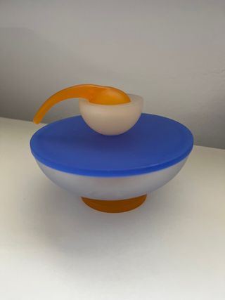 Zuccheriera dal design moderno, completa di cucchiaino. - Base con piedini in arancione. - Coperchio blu. - Ciotola interna traslucida.