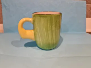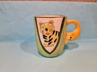 Tazza in ceramica con un simpatico disegno di una tigre dipinta a mano. Il manico è a forma di testa di tigre. - Disegno di una tigre stilizzata. - Manico a forma di testa di tigre arancione.