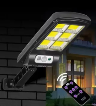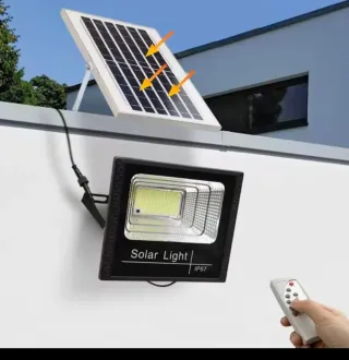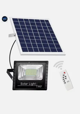 Potente faro LED da esterno alimentato ad energia solare, completo di pannello fotovoltaico e telecomando per una gestione comoda. - Illuminazione efficiente e a basso consumo. - Ideale per esterni, giardini e cortili. - Facile installazione.