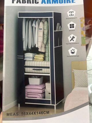 Armadio in tessuto, pratico e leggero per organizzare i tuoi vestiti e accessori. - Struttura robusta con buona capacità di carico. - Divisione interna per una migliore organizzazione. - Montaggio semplice senza bisogno di attrezzi. - Protezione dalla polvere per conservare al meglio i tuoi capi.