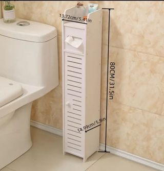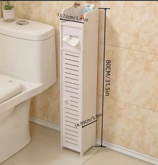 Mobiletto in stile shabby chic, perfetto per organizzare piccoli spazi. - Design sottile e verticale. - Dotato di vano porta rotolo. - Ante a listelli per un tocco decorativo. - Maniglia a pomello per un facile accesso.
