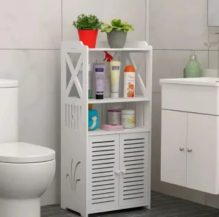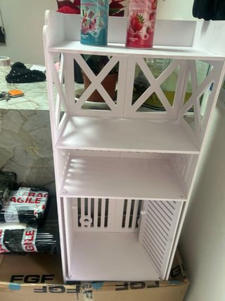 Mobiletto in stile shabby chic, perfetto per ottimizzare lo spazio in bagno o in altre stanze. Il design a colonna lo rende ideale per gli angoli. - Struttura sottile e alta. - Ante con fessure per ventilazione. - Scomparto superiore aperto. - Vano porta rotolo integrato.