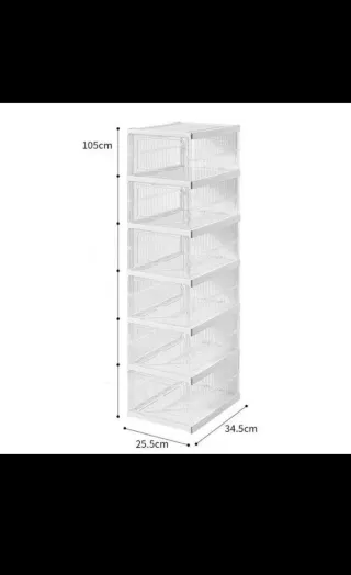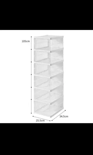 Pratica scarpiera pieghevole a 6 ripiani, perfetta per organizzare le tue scarpe. - Struttura in plastica resistente. - Design trasparente per vedere facilmente il contenuto. - Montaggio e smontaggio rapidi. - Dimensioni: 105cm x 34.5cm x 25.5cm.
