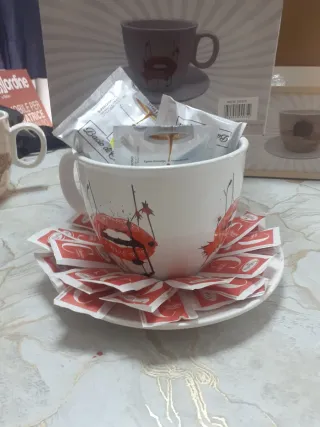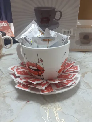 Originale portacialde a forma di tazza, perfetto per dare un tocco di stile alla tua cucina o al tuo ufficio. La decorazione con labbra rosse aggiunge un elemento di design unico. - Realizzato in ceramica di alta qualità. - Design moderno e accattivante.