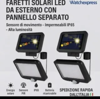 Set di 2 faretti LED da esterno con pannello solare separato. Ideali per illuminare giardini, vialetti o ingressi. - Sensore di movimento PIR integrato. - Impermeabili con certificazione IP65. - Alta luminosità. - Batteria ricaricabile. - Spedizione rapida dall'Italia.