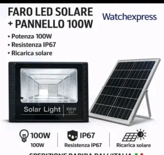 Potente faro LED solare da 100W completo di pannello solare per la ricarica. Ideale per illuminare esterni. - Potenza 100W - Resistenza IP67 - Ricarica solare - Spedizione rapida dall'Italia