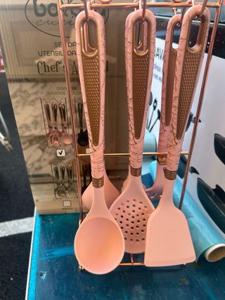 Elegante set di utensili da cucina Chef's Art. - Manici con finitura marmorizzata rosa e dettagli oro. - Supporto in metallo color oro. - Include mestolo, schiumarola e spatola.