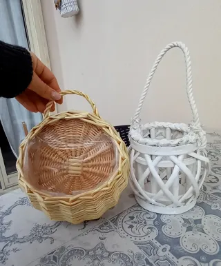 Set composto da una fioriera da parete e un portacandele in stile shabby. - Fioriera in vimini con manico. - Portacandele decorativo con manico intrecciato.entambinin vimini la fioriera è nuova mai usata il portacandela e anch esso in perfetto stato, e si può fare qualsiasi uso se ne voglia, sconto del 10% a partire dall acquisto di almeno due articoli 💢 spedizione veloce 💢 la fioriera misura 18 x 8 il portacandela e menzionato nelle misura dell articolo