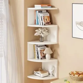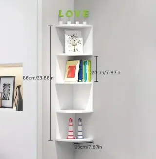 Scaffale angolare bianco a 4 ripiani, perfetto per ottimizzare lo spazio. - Struttura in legno resistente. - Design moderno e pulito. - Ideale per libri, decorazioni e piccoli oggetti.