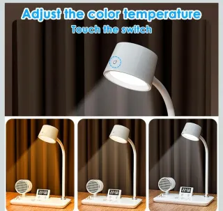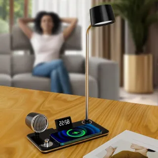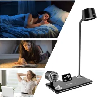 Lampada da tavolo multifunzione con cassa e caricabatterie integrati. - Design moderno e funzionale. - Illuminazione touch. - Base di ricarica wireless.