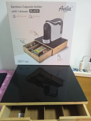 Elegante portacialde con un design moderno. - Struttura in bambù naturale. - Piano superiore in vetro nero. - Cassetto con divisori interni per organizzare le capsule.