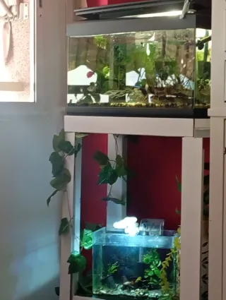 In vendita due acquari. Fabbricati in vetro e plastica. Colore nero e trasparente.