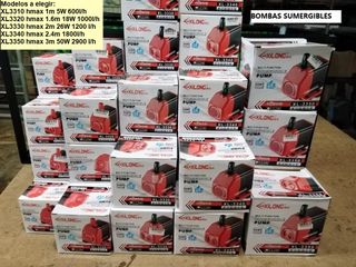 Gamma di pompe acqua totalmente sommerse con regolatore di flusso. Modelli disponibili: XL3310 hmax 1m consumo 5W 600l/h 12€ XL3320 hmax 1.6m 18W 1000l/h 17€ XL3330 hmax 2m 26W 1200l/h 22€ XL3340 hmax 2.4m 1800l/h 29€ XL3350 hmax 3m 50W 2900l/h 42€ 220V cavo con spina spagnola inclusa. Adatti per acquari, vasche pesci, stagni, presepi, fontane, idroponica. Spedizioni tramite Correos (solo 3€) o acquista con l'App Wallapop, che protegge il tuo pagamento e permette la restituzione con rimborso del 100% incl. spese di spedizione. Indica il modello che ti interessa e cambio il prezzo dell'annuncio.