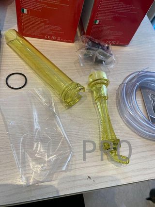 Nuovo, prefiltro cilindrico per acquari, progettato per migliorare la qualità dell'acqua. Le uscite delle tubature sono 12/16 e poi con gli adattatori 16/22.