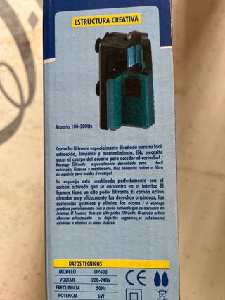 Un filtro a zaino per acquari piccoli da 20-40 litri SENZA COPERCHIO, filtra 280 litri all'ora. Perfetto per pesci che sporcano molto o tartarughe, facile da pulire. Il filtro si appende a una delle pareti in vetro dell'acquario, è per acquari SENZA COPERCHIO, attenzione. Spedizione tramite Correos in tutta la Spagna inclusa Canarie (il costo della spedizione è di soli 3€) o acquistalo con l'App Wallapop, che protegge il tuo pagamento e ti permette di restituire il prodotto con rimborso del 100% incl. spese di spedizione. Include la spugna ma non i cannucce.