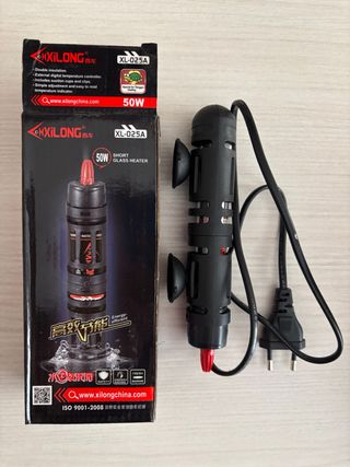 Riscaldatore XILONG XL-025A 50W per acquari o aquuterrari. È praticamente nuovo. Utilizzato solo per meno di un mese per un acquaterrario per tartarughe. - Doppio isolamento - Regolatore di temperatura tra 17 e 35 gradi. - Include ventose e protezione.