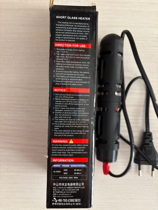 Vendo riscaldatore per acquario 300W nuovo, per acquari e vasche da 90 litri in su. Ha termostato per regolare la temperatura e luce arancione soffusa all'accensione. Misura 32 cm, ma può essere posizionato in orizzontale o diagonale anche con le ventose incluse. Disponibile anche, allo stesso prezzo, con custodia in plastica e ventose (vedi foto) per tartarughe. Spedizioni tramite Correos in tutta la Spagna incl. Canarie (il costo della spedizione è solo 3€) o acquistalo con l'App Wallapop, che protegge il pagamento e ti permette di restituire il prodotto e ricevere il 100% del tuo denaro e le spese di spedizione e restituzione. EFFETTUO SPEDIZIONI