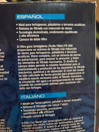 Filtro speciale per acquari da 10-40 litri, richiede poca altezza d'acqua, minimo 1,5 cm, perfetto per pesci che sporcano molto o tartarughe, facile da pulire. Include membrana filtrante con biobolle (per batteri). 200 litri/ora, potenza solo 2,5 W. Silenzioso e robusto. Adatto anche per acqua salata. Altezza 8 cm. Posizionare sul fondo dell'acquario o attaccato alla parete a qualsiasi altezza con ventose incluse. Spedizione tramite Correos solo 3€ o acquisto con App Wallapop che protegge il pagamento e consente la restituzione. Per tartarughe vendo anche: riscaldatore acqua, coperta termica, rampa, lampada, lampadina luce UVA e calore