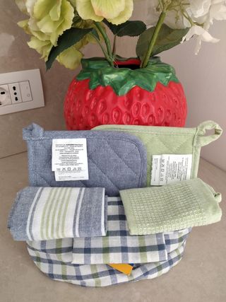Bellissimo set di strofinacci per la cucina, perfetti per aggiungere un tocco di colore e praticità. - Il set include 3 strofinacci in cotone, 2 presine, 1 portapane - Sono in ottime condizioni. - Misure: come da foto.