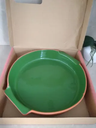 Bellissimo tegame in terracotta, perfetto per la tua cucina. - Colore interno verde brillante. - Esterno color arancio. - Materiale: ceramica e terracotta.