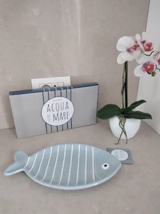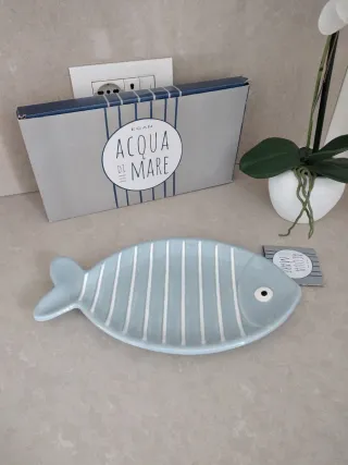 Grazioso piatto decorativo a forma di pesce, perfetto per aggiungere un tocco di originalità alla tua tavola o come soprammobile. - Design a forma di pesce con strisce bianche. - Realizzato in ceramica di alta qualità.