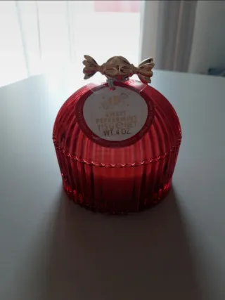 Candela profumata con un delizioso aroma a menta piperita, contenuta in un elegante portacandele rosso con decorazione dorata a forma di caramella. - Fragranza: Sweet Peppermint - Peso netto: 115 g / 4 oz - Durata: fino a 12 ore