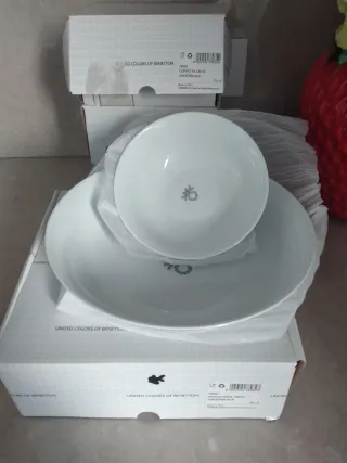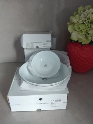 Elegante set di dodici ciotole + una insalatiera in ceramica, perfette per ogni occasione. Il design moderno si adatta a qualsiasi stile di cucina. - Set composto da 12 ciotole + 1 insalatiera - Realizzate in ceramica di alta qualità. - Logo del brand United Colors of Benetton. Scatole ancora sigillate
