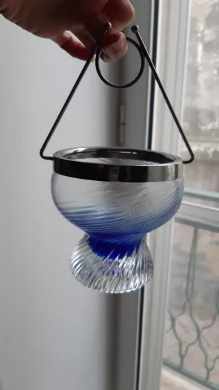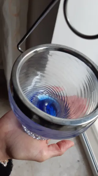 Elegante secchiello porta ghiaccio dal design vintage. Un accessorio che aggiunge un tocco di stile alla tua tavola. - Realizzato in vetro con finiture metalliche. - Dettagli blu e trasparenti.