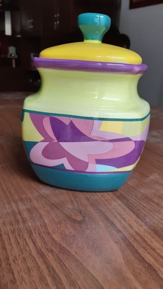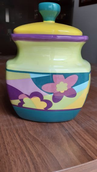 Barattolo in ceramica con un design vivace e colorato. - Motivo floreale astratto. - Coperchio con pomello. - Base e bordo decorati.