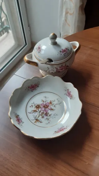Servizio di piatti vintage da dolce costituito da: - Una coppa (disegno scolorito) - 5 coppette macedonia (una è sbeccata vedi foto) - 6 piattini da dolce (uno è sbeccato vedi foto) - 1 piatto torta Porcellana Limoges La S. Marco