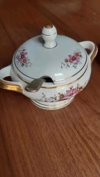 Elegante zuccheriera vintage PG, un pezzo unico per la tua tavola. - Realizzata in ceramica di alta qualità. - Decorata con delicati motivi floreali. - Bordi e manici con finitura dorata. - Compreso piattino