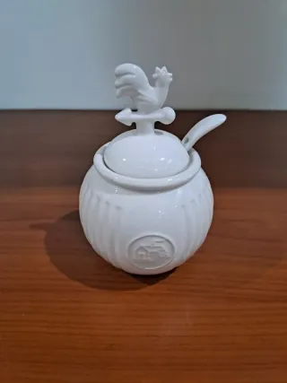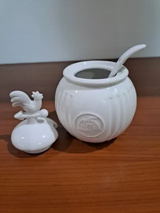 Zuccheriera della collezione Mulino Bianco del 2014. Un pezzo da collezione con un design unico. - Decorazione a forma di gallo sul coperchio. - Include cucchiaino. - Motivo a rilievo sul corpo del contenitore.