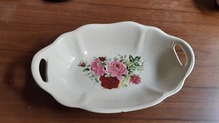 Piattino allungato ovale (ravier) con motivo floreale con bordi smerlati e due manici aperti. Ideale come centrotavola o svuotatasche