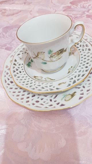 Bellissimo tris da tè in porcellana, con dettagli in oro. Il servizio comprende una tazza, un piattino e un piatto da dolce. I pezzi sono decorati con un delicato motivo di uccellini. Sono perfetti per un tè pomeridiano elegante! - Set da tre pezzi - Motivo uccelli - Dettagli oro