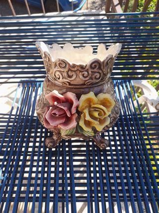 Elegante vaso vintage in ceramica, perfetto per aggiungere un tocco di stile alla tua casa. - Decorato con rose in rilievo. - Design unico con finiture elaborate.