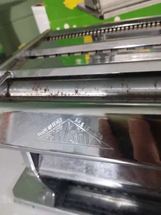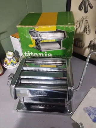Macchina per la pasta manuale Titania, modello Excelsius 150. - Struttura in metallo cromato. - Manopola per regolare lo spessore della sfoglia. - oggetto vintage da collezione presenta ruggine sui rulli vedi foto facilmente removibile con aceto bianco cartone originale e libretto d' istruzioni originale invecchiati dal tempo per gli amanti