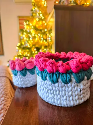 Set di due cestini decorativi realizzati a mano, perfetti per aggiungere un tocco di colore e originalità alla tua casa. - Design unico con decorazioni floreali. - Realizzati in tessuto resistente. - Ideali come portaoggetti o centrotavola.