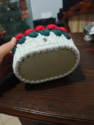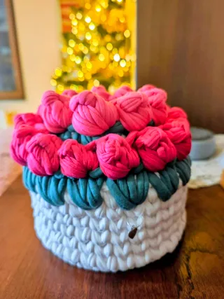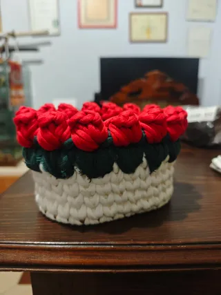 Grazioso cestino decorativo realizzato a mano, perfetto per aggiungere un tocco di colore e originalità. - Decorato con rose rosse. - Base in tessuto bianco. - Dettagli verdi tra le rose.
