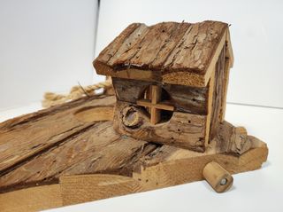 Casetta in legno grezzo, ideale per criceti o piccoli roditori. Presenta un design rustico con tetto spiovente e un'apertura. Il prodotto non è mai stato usato - Materiale: Legno grezzo - Larghezza: 35 cm / Profondità: 24 cm / Altezza: 13 cm