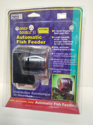 Distributore automatico di cibo per pesci. - Alimentazione a batteria. - Grande capacità, sufficiente per 4 settimane di cibo. - Programmazione per due pasti al giorno.