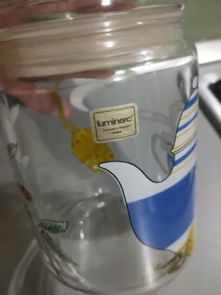 Barattolo vintage Luminarc, perfetto per tè o caramelle. Un pezzo decorativo con un design unico. - Decorazione con motivi floreali e teiera. - Coperchio in vetro trasparente.
